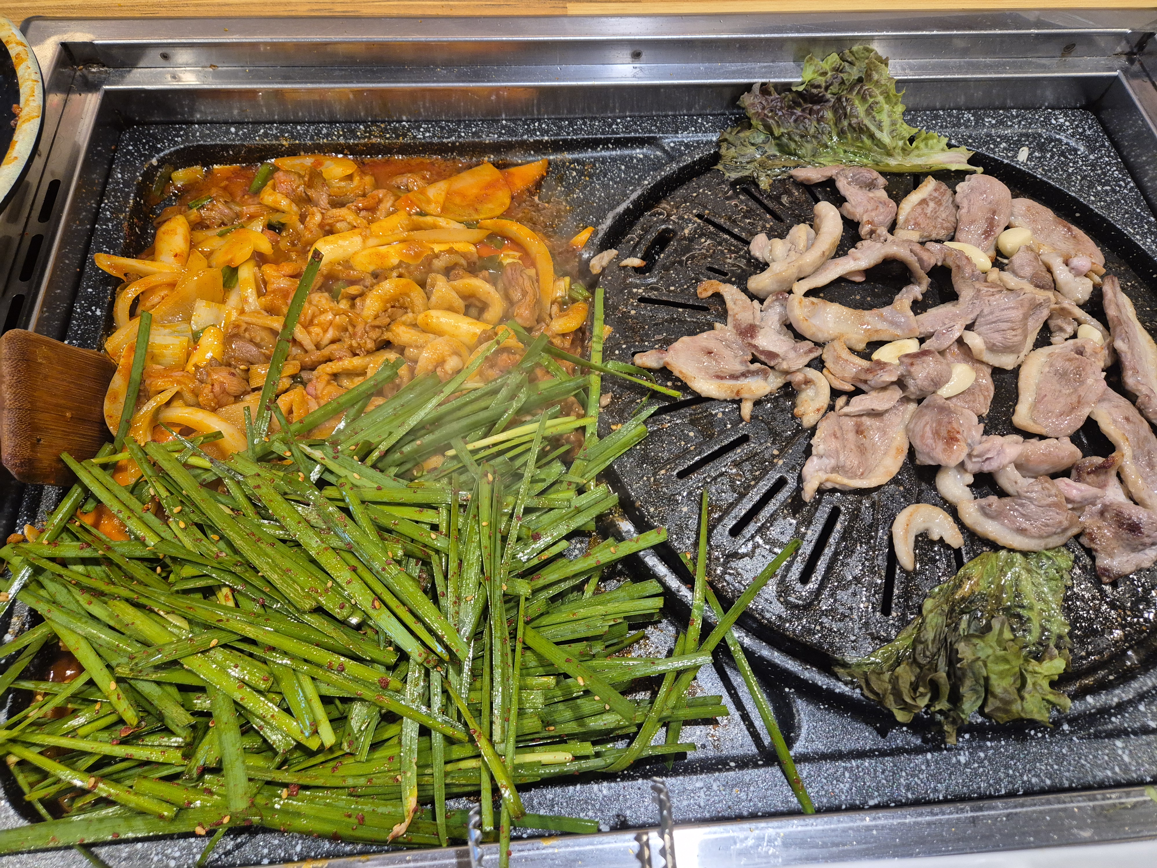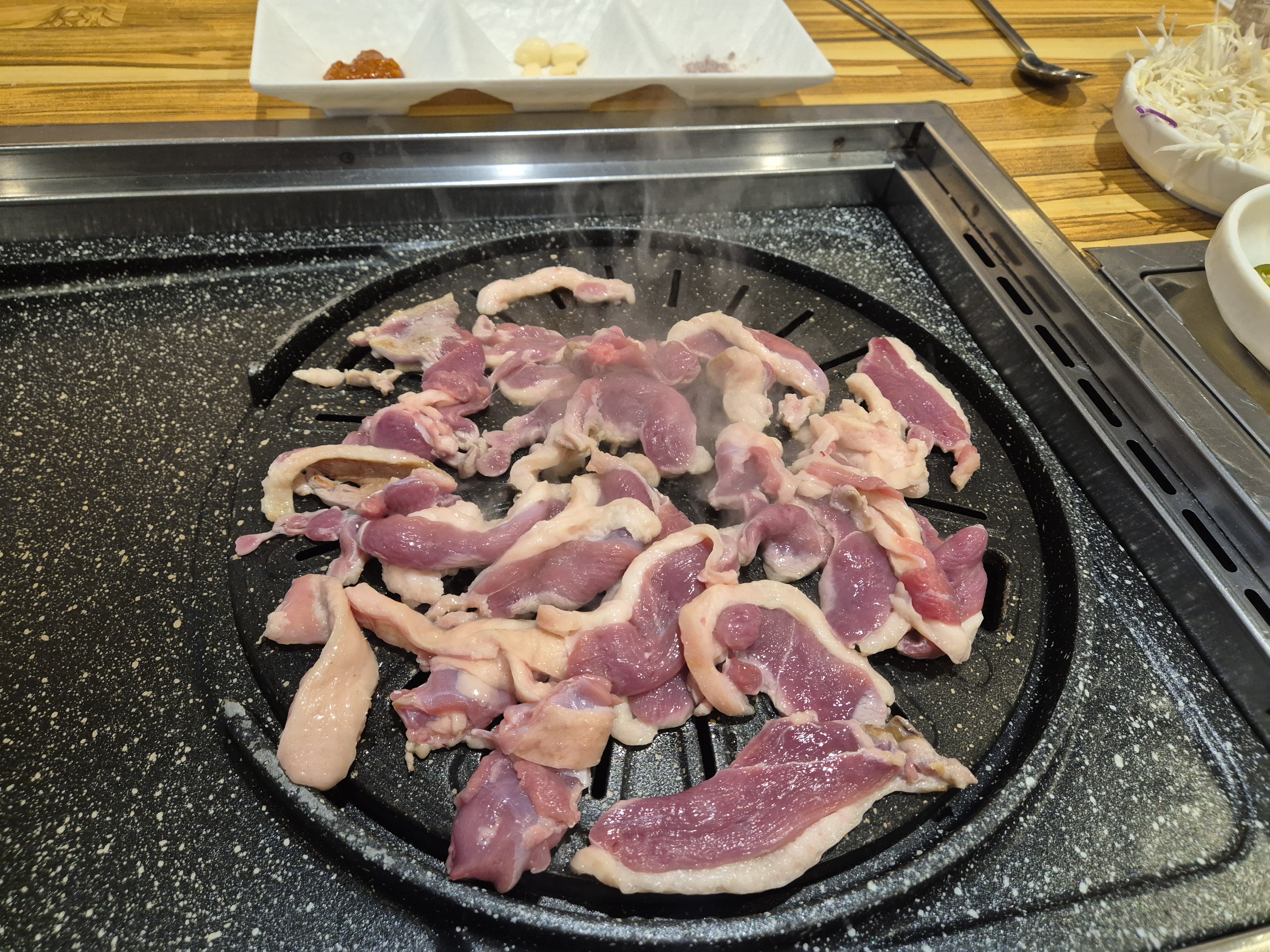 우리는 생오리 로스와 주물럭을 반반으로 주문했는데, 불판도 반반으로 되어있어서 신기했다.