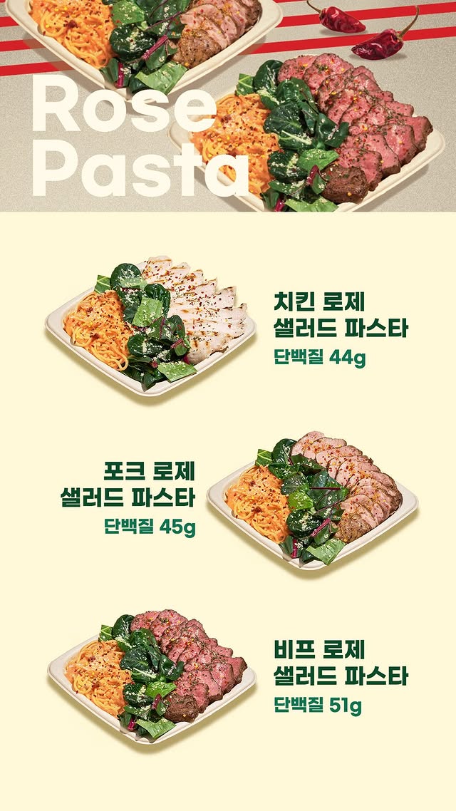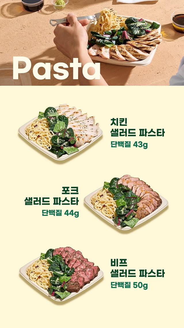 신선한 채소 위에 닭가슴살, 그리고 파스타 면이 함께 들어있어 샐러드를 먹으면서도 탄수화물 보충이 가능