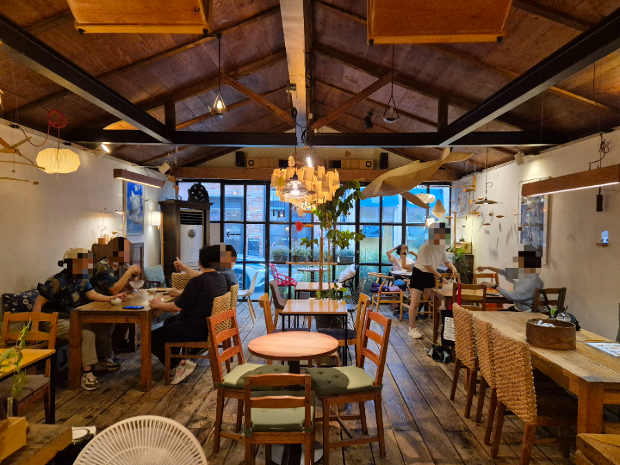 내부는 따뜻한 조명과 우드톤 인테리어, 그리고 천장에 걸려 있는
